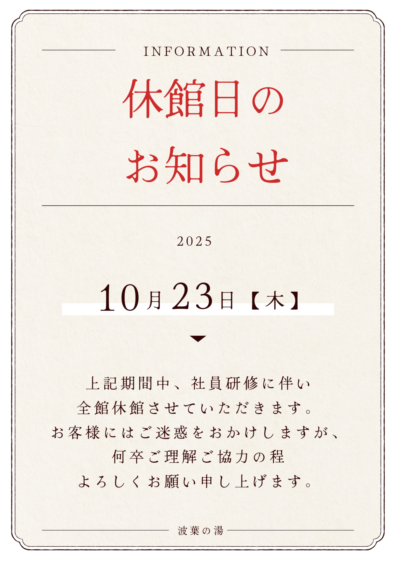 ご入浴:10:00~23:00(最終受付22:15) ※最終利用時間 サウナ:22:40 浴室:22:45 脱衣所:22:50 岩盤浴:10:00~22:30(最終受付21:30) 貸切風呂10:00~22:30(最終受付21:00) 年中無休(年数回 設備点検休業あり)