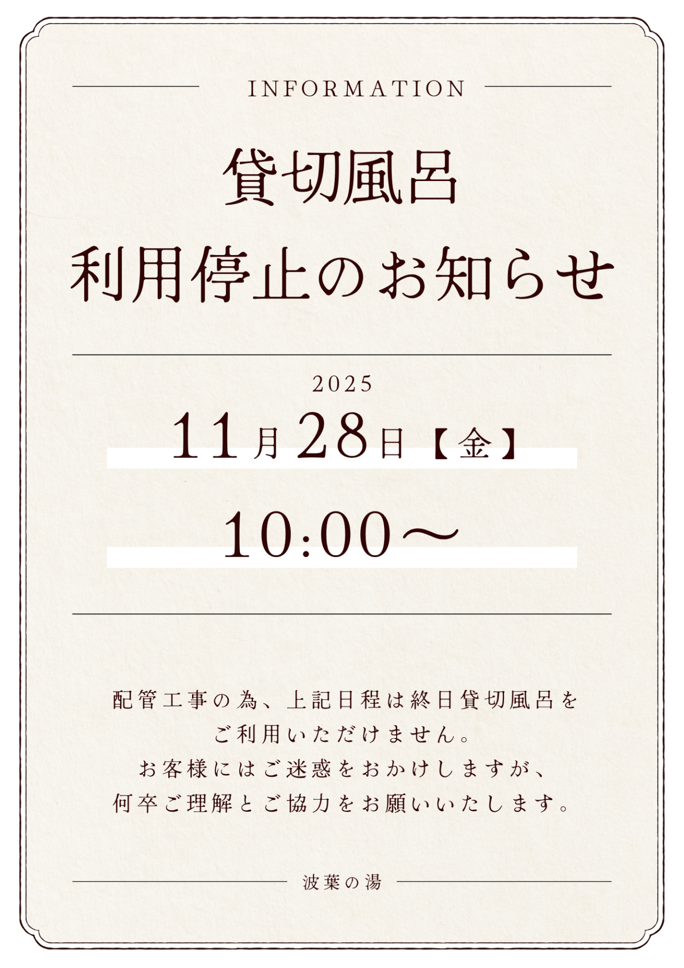 ご入浴:10:00~23:00(最終受付22:15) ※最終利用時間 サウナ:22:40 浴室:22:45 脱衣所:22:50 岩盤浴:10:00~22:30(最終受付21:30) 貸切風呂10:00~22:30(最終受付21:00) 年中無休(年数回 設備点検休業あり)