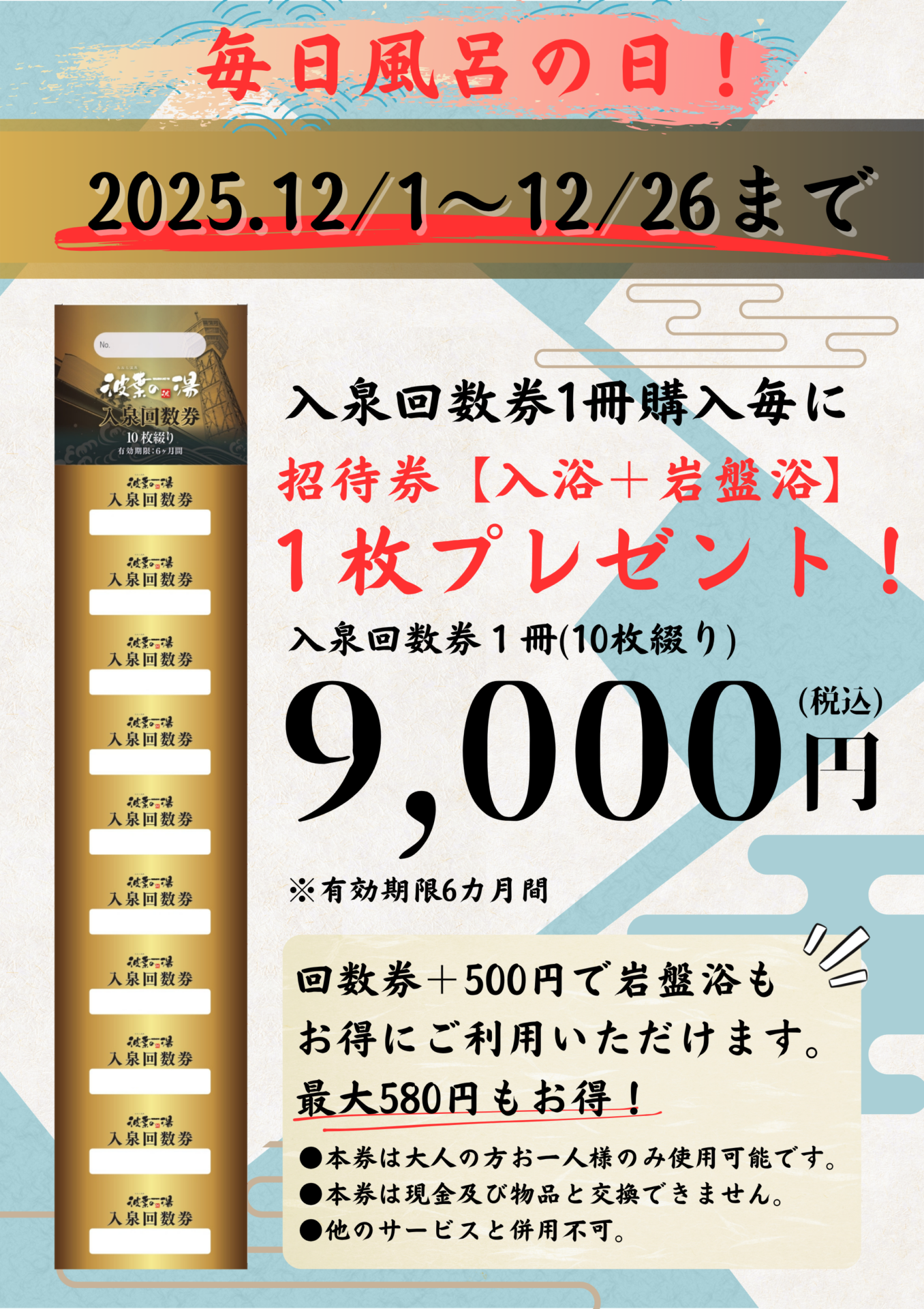 ご入浴:10:00~23:00(最終受付22:15) ※最終利用時間 サウナ:22:40 浴室:22:45 脱衣所:22:50 岩盤浴:10:00~22:30(最終受付21:30) 貸切風呂10:00~22:30(最終受付21:00) 年中無休(年数回 設備点検休業あり)