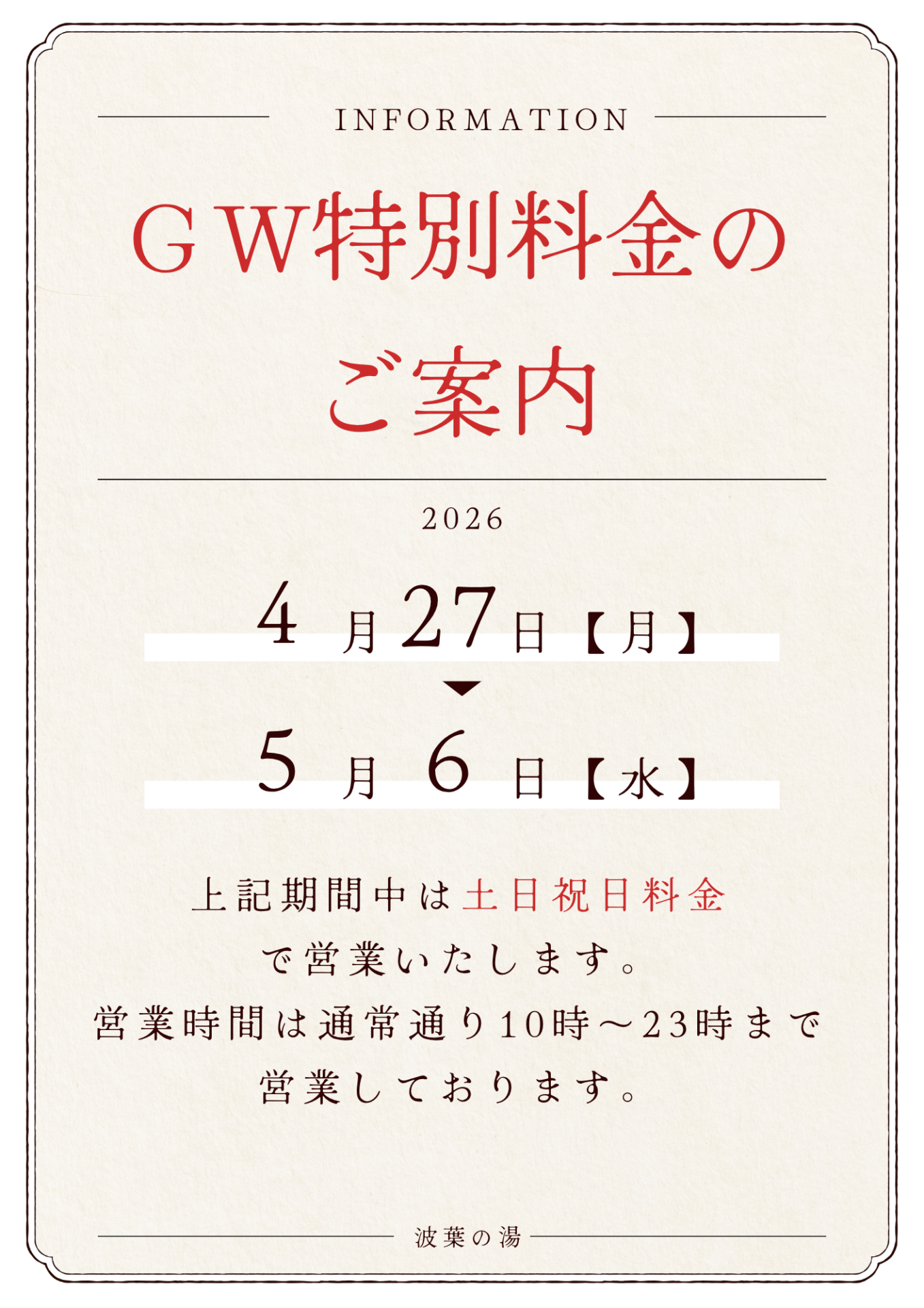 ご入浴:10:00~23:00(最終受付22:15) 岩盤浴:10:00~22:30(最終受付21:30)貸切風呂10:00~22:30(最終受付21:00)年中無休(年数回 設備点検休業あり) 【お問い合わせ】092-271-4126(お食事処 092-271-4138 / リラクゼーション 092-271-1120 / カットサロン 092-272-1538)