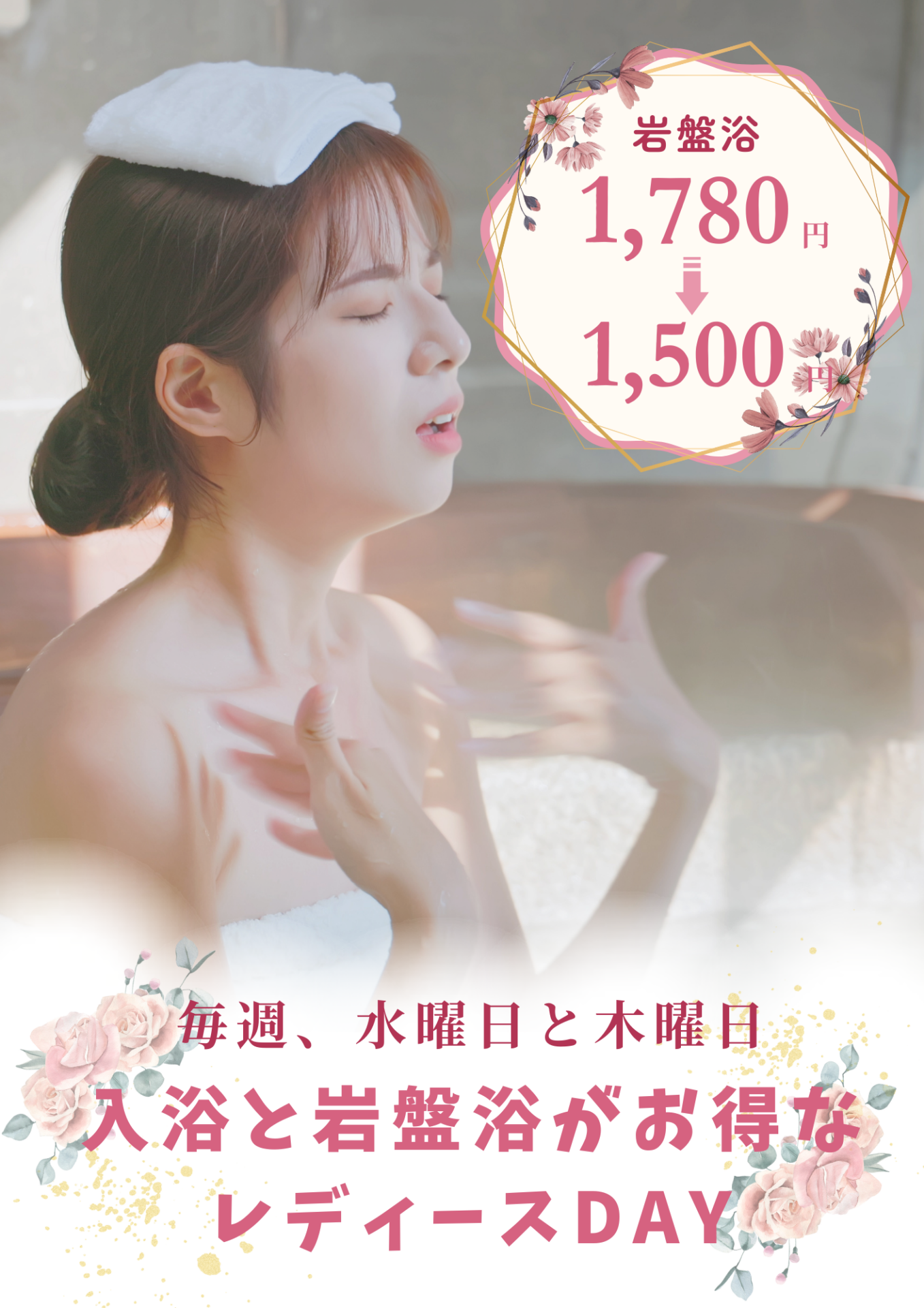 毎週水曜日 (祝日は除く)。 女性のみ岩盤浴1780円を1500円に割引!