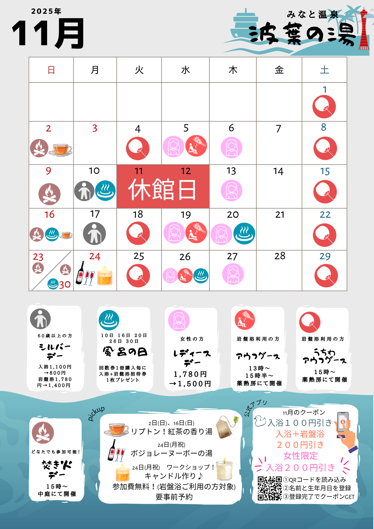 ご入浴:10:00~23:00(最終受付22:15) ※最終利用時間 サウナ:22:40 浴室:22:45 脱衣所:22:50 岩盤浴:10:00~22:30(最終受付21:30) 貸切風呂10:00~22:30(最終受付21:00) 年中無休(年数回 設備点検休業あり)
